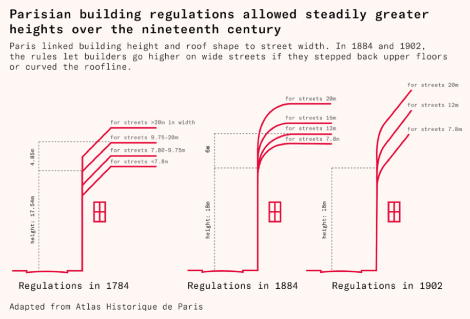 En 1890, la plupart des villes d’Europe continentale autorisaient la construction de cinq à dix étages n’importe où. Dans l’Empire britannique et aux États-Unis, les autorités n’imposaient généralement aucune limite de hauteur. Des règles détaillées de sécurité incendie existaient depuis des siècles, mais les règles encadrant l’urbanisation demeuraient pour le reste très peu contraignantes.