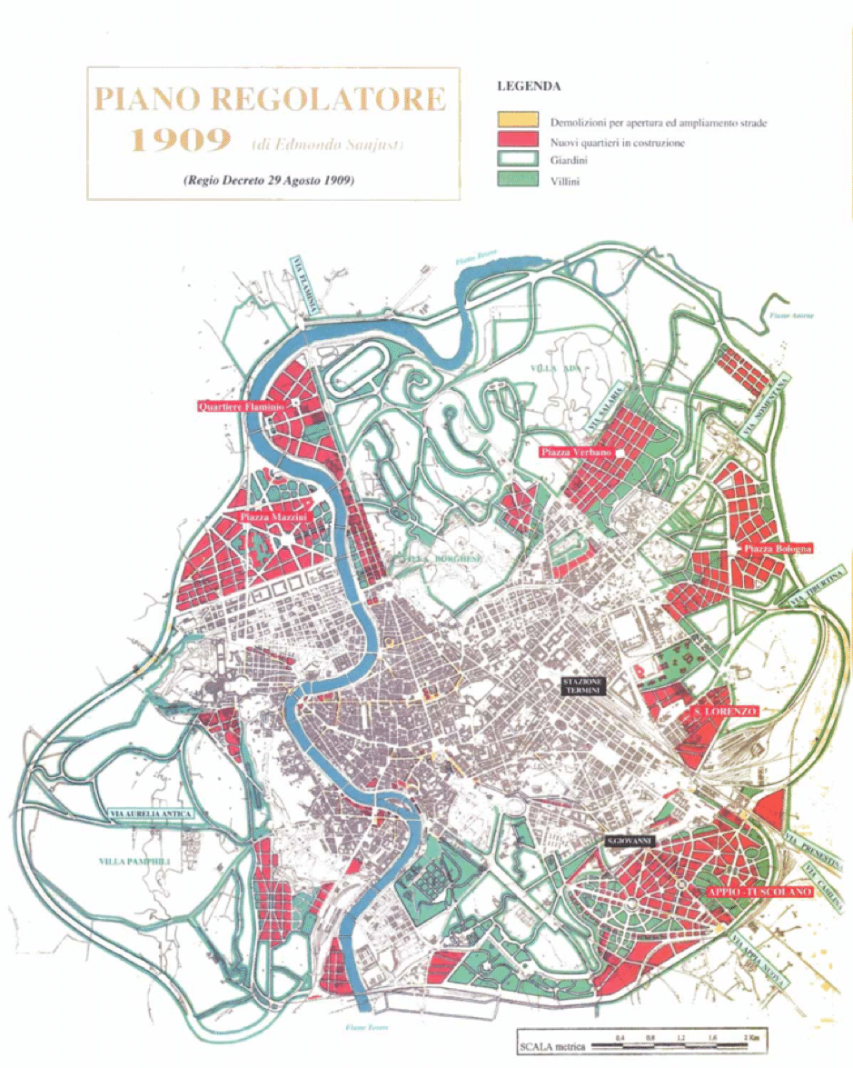 Le plan d’urbanisme adopté à Rome en 1909 était radical. Les zones figurées en rouge autorisaient encore les immeubles traditionnels à cour intérieure, mais à des densités inférieures à celles pratiquées jusque-là. Les zones figurées en vert n’autorisaient que des villini, de petits immeubles collectifs isolés ne dépassant pas trois étages, et n’occupant, au maximum, que la moitié de la surface de leur îlot. Les vastes secteurs délimités par un contour vert et remplis de blanc étaient classés en giardini — littéralement des jardins