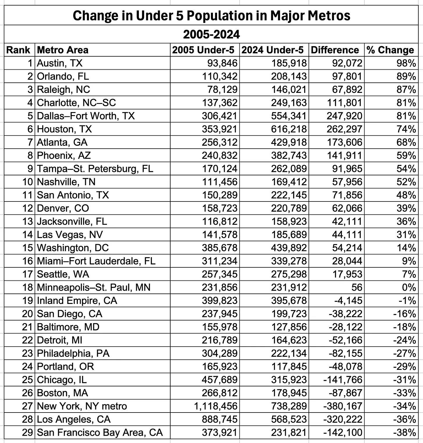 Regardons les métropoles qui gagnent des jeunes enfants : Austin, Orlando, Raleigh, Charlotte, Dallas, Houston.