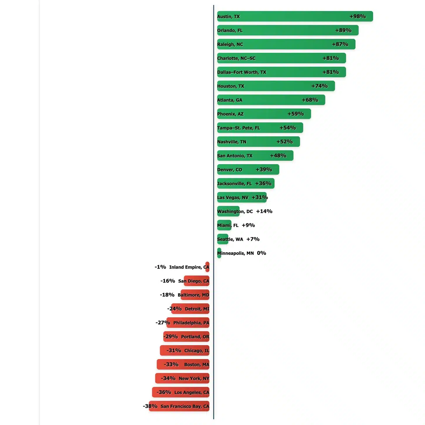 Austin (+98 %), Orlando (+89 %), Raleigh (+87 %) et Charlotte (+81 %) ont bondi.