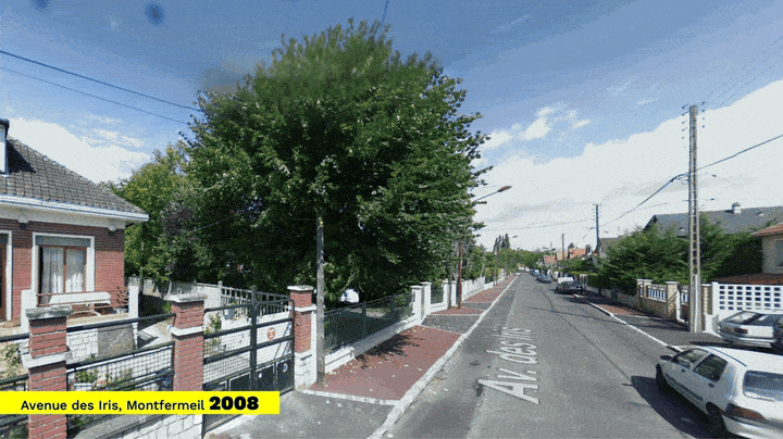 Un exemple de l’évolution du couvert végétal des parcelles privées dans le tissu pavillonnaire de Montfermeil, sur le secteur étudié. La disparition du végétal perçue depuis l’espace public et la simplification des jardins se sont produites en dehors de tout processus de densification et, 6 fois sur 10, à l’initiative des propriétaires occupants.