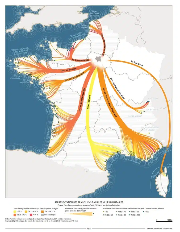Si on ajoute les infos de la carte ci-dessus (figure n°2), qui mesurent le volume des flux et les PDM par destination, on rajoute une couche d’infos hyper précise. Cette carte elle donne les flux des parisiens la semaine du 15 aout, en précisant combien ces derniers pèsent en % du total des touristes. Cette semaine les parisiens pèsent 40% des touristes en Bretagne, mais 19% sur les plages occitanes.
